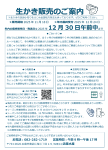情報ご提供 有限会社 浜里水産 広島郷心会 2025.10.22 生かき販売のご案内 生かきの店頭小売りをはじめ全国地方発送も承っております。 ぜひご利用ください。 販売開始2025年11月18日 ~年内最終受付2025 […]