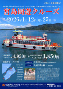 情報ご提供 安芸グランドホテル 大竹郷心会 2026.01.13 宮島周遊クルーズ 2026年1月12日(月)・25日(日) PDFファイル お問い合わせは、PDF記載の お問い合わせ先までお願いいたします。