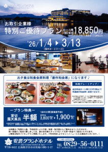 情報ご提供 安芸グランドホテル 大竹郷心会 2026.01.13 特別ご優待プラン 2026年1月4日〜3月13日 PDFファイル お問い合わせは、PDF記載の お問い合わせ先までお願いいたします。
