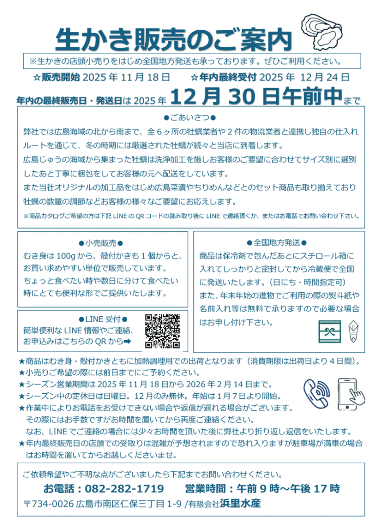 情報ご提供 有限会社 浜里水産 広島郷心会 2025.10.22 生かき販売のご案内 生かきの店頭小売りをはじめ全国地方発送も承っております。ぜひご利用ください。販売開始2025年11月18日 ~年内最終受付2025年 12月24日年内の最終販売日・発送日は2025年12月30日午前中まで PDFファイル お問い合わせは、PDF記載の お問い合わせ先までお願いいたします。