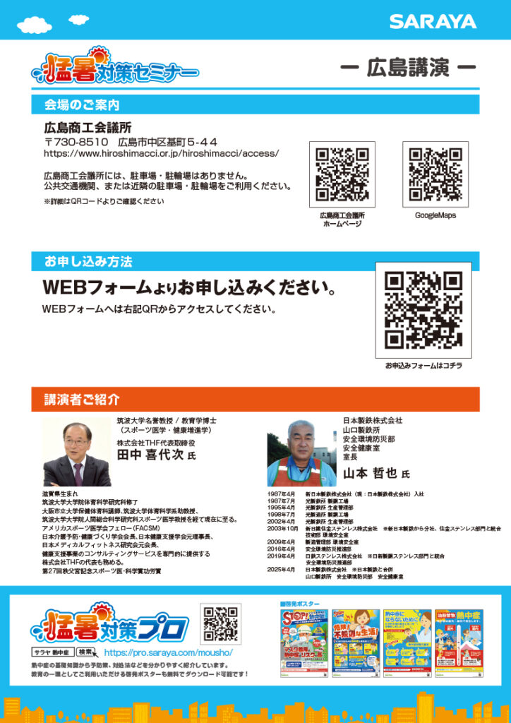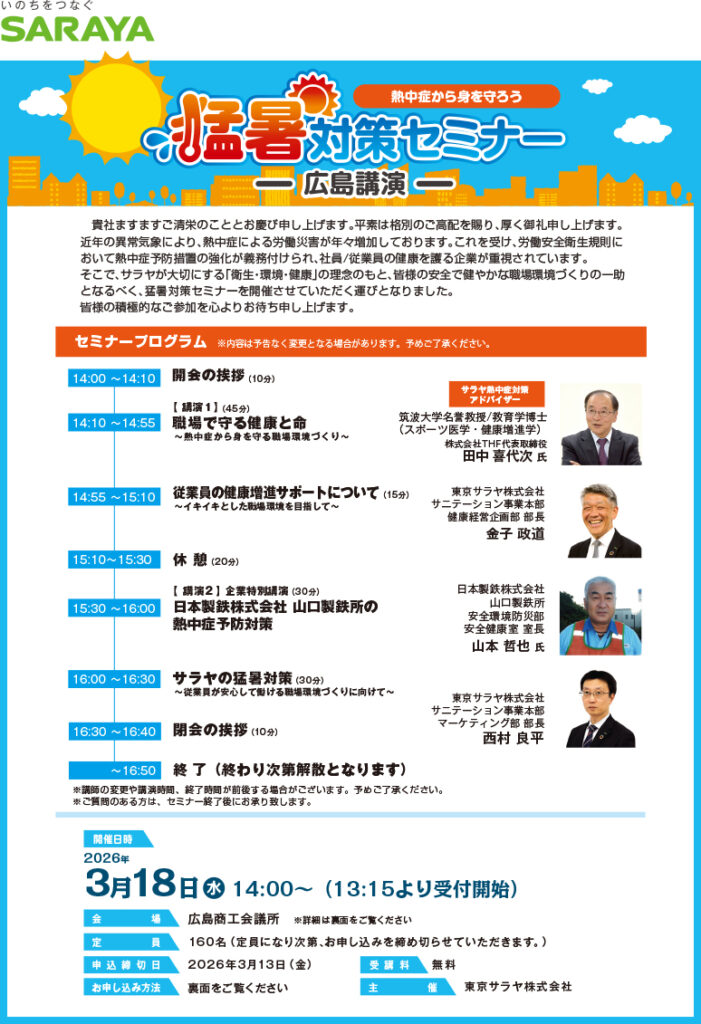 情報ご提供 サラヤ株式会社 中四国支店 広島郷心会 2026.01.26 猛暑対策セミナー 労働安全衛生規則に、おいて熱中症予防措置の強化が義務付けられ、社員/従業員の健康を護る企業が重視されています。皆様の積極的なご参加を心よりお待ち申し上げます。 PDFファイル お問い合わせは、画像記載の お問い合わせ先までお願いいたします。