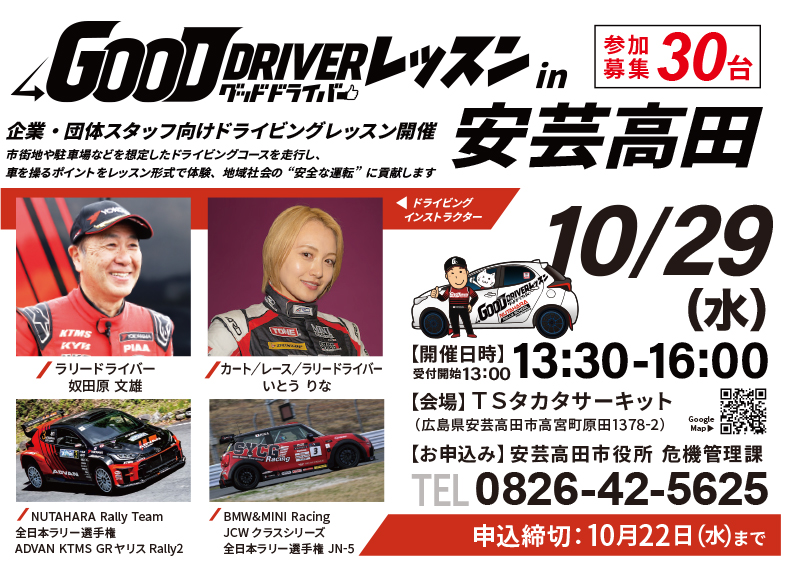 情報ご提供 ボデーショップタカタ 三次郷心会 2025.10.16 グッドドライバーレッスン in 安芸高田企業・団体スタッフ向けドライビングレッスン開催 PDFファイル お問い合わせは、PDFまたは画像記載の お問い合わせ先までお願いいたします。